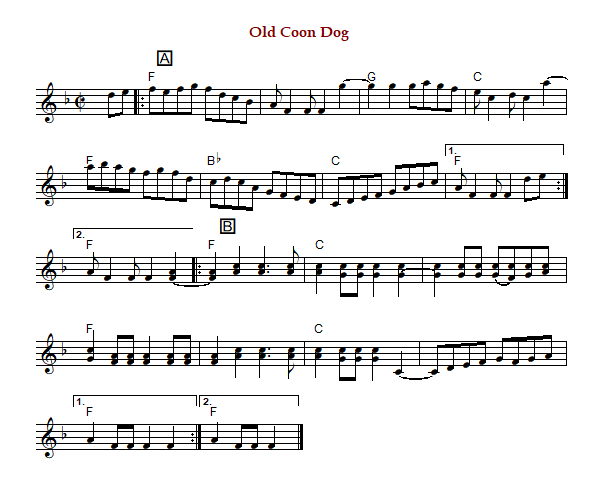 The tune is known by the "Old Coon Dog" title in eastern Kentucky and central Appalachia, according