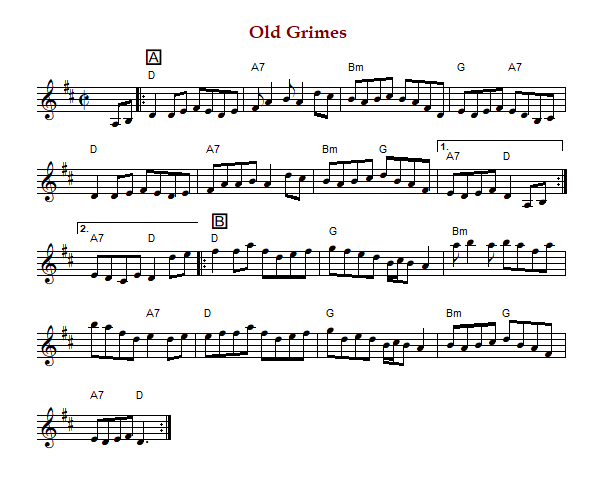 "Old Grimes" is an American reel in D major. The parts are played AA’BB’.