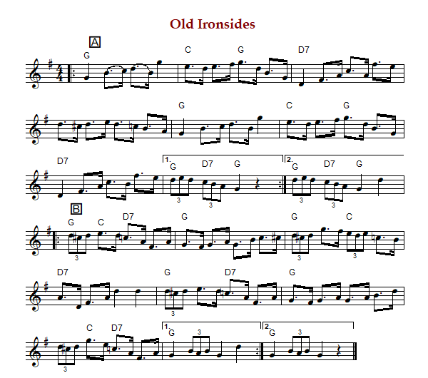 "Old Ironsides" is an American hornpipe in G Major. The parts are played AABB (Cole) or