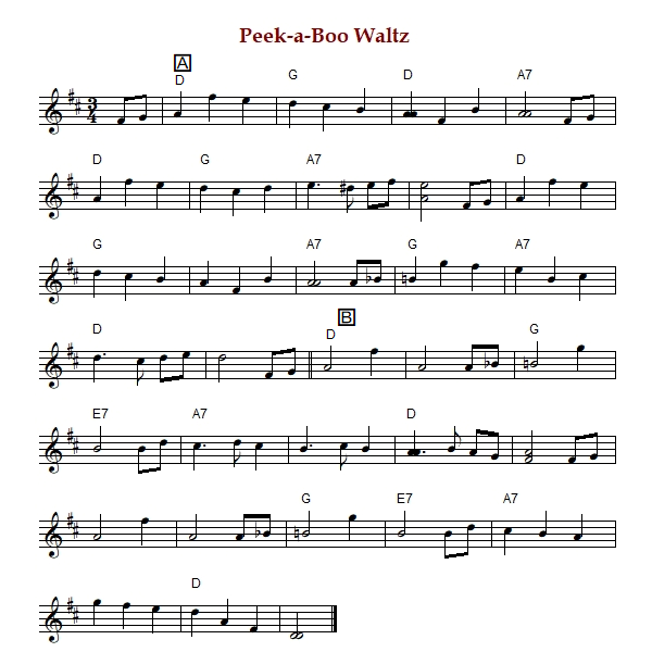 "Peek-a-Boo Waltz" is an American and Canadian waltz in 3/4 time and D Major (most versions) or