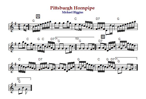 "Pittsburgh Hornpipe" is an American hornpipe in G Major. The parts are played AABB.