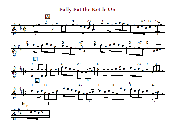 "Polly Put the Kettle On", also known as "Molly Put the Kettle On", “Barney Leave the