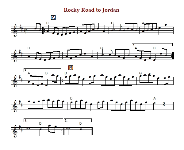 "Rocky Road to Jordan" is an old-time reel in D Major. The parts are