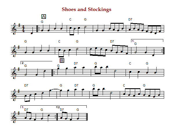 "Shoes and Stockings" is an American reel in 4/4 or cut time and G Major.