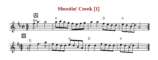 "Shootin' Creek" is an American reel in cut time and A Mixolydian.