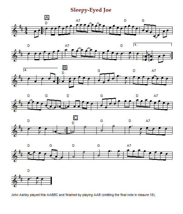 "Sleepy-Eyed Joe" is an American reel in cut time and E Major (Phillips) or