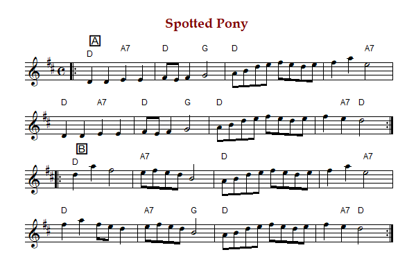 "Spotted Pony" is an old‑time breakdown in D Major. The parts are played AB (Silberberg),