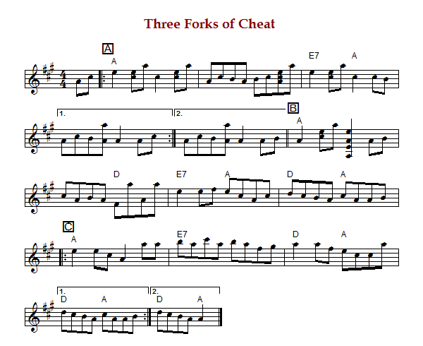 "Three Forks of Cheat" is played with the fiddle tuned AEac#, a widespread tuning for