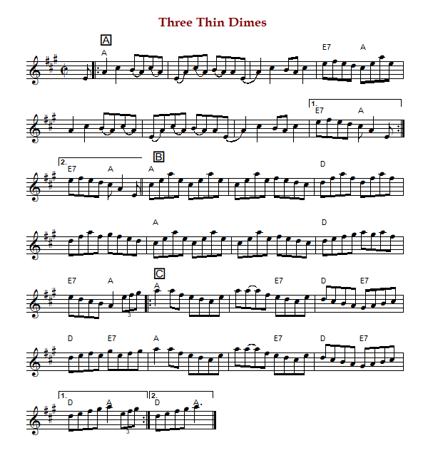 "Three Thin Dimes" is an American reel in 2/4 time and A Major. The parts are played