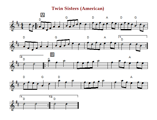 "The Two Sisters" is an American reel in 4/4 or cut time in D Major. The parts are played AB