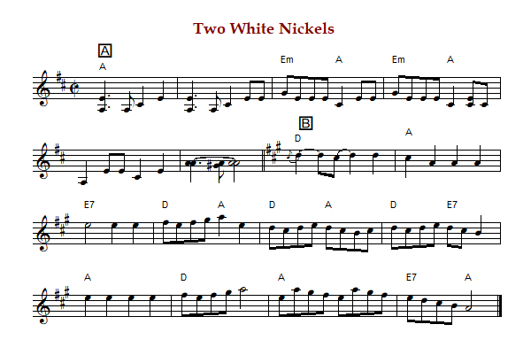 "Two White Nickels", also known as "Two Wide Nickels" is an American reel in cut or
