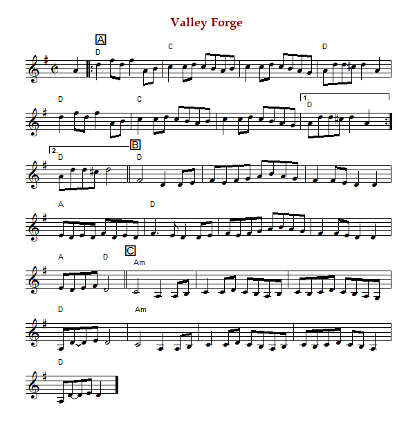 "Valley Forge" is an American reel in cut time and D Major/Mixolydian (most versions) or A Major.