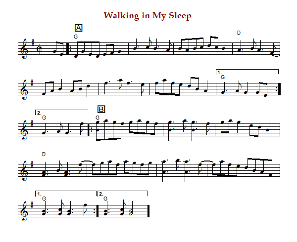 "Walking in My Sleep" is an old-time breakdown in G Major. The parts are played AB (Silberberg) or AABB (Phillips).