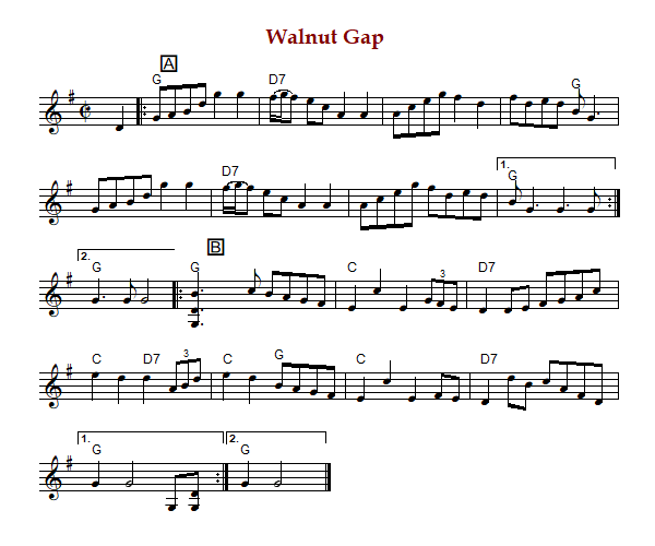 "Walnut Gap" is an American barn dance or schottische in cut time and G Major.