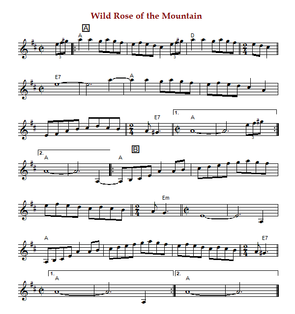 "Wild Rose of the Mountain" is an old-time reel in A Major/Mixolydian. The parts are