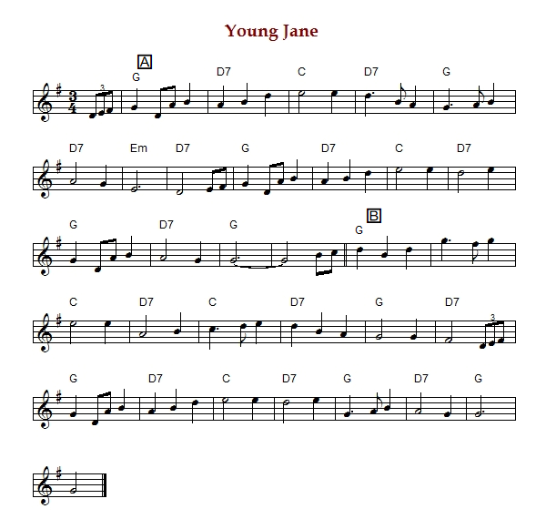 "Young Jane" is an English waltz in G Major. The parts are played AB.